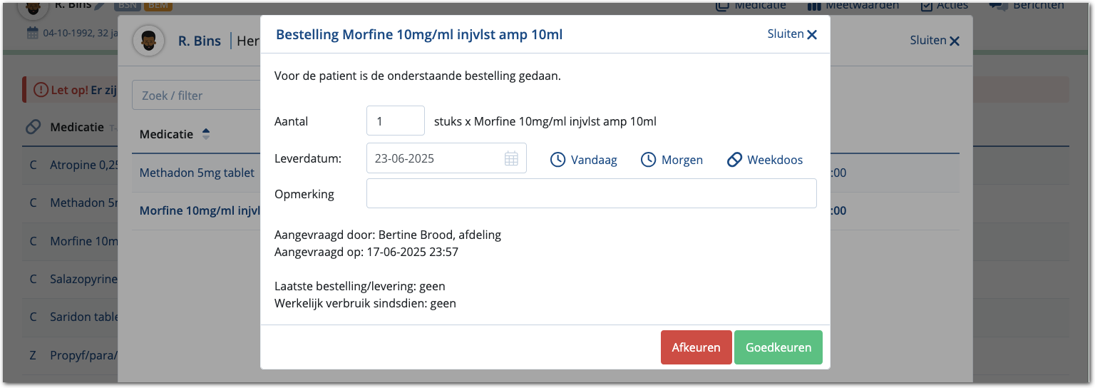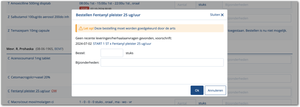 De zorg kan medicatie rechtstreeks bij de apotheek bestellen. Voor opiaten kan worden ingesteld dat aanvragen van de zorg worden geaccordeerd door een voorschrijver voordat de bestelling wordt verstuurd naar de apotheek. Hiermee is er meer controle op de bestelling van opiaten. Dit kan worden ingesteld voor aanvragen van opiaten voor cliënten en werkvoorraden.