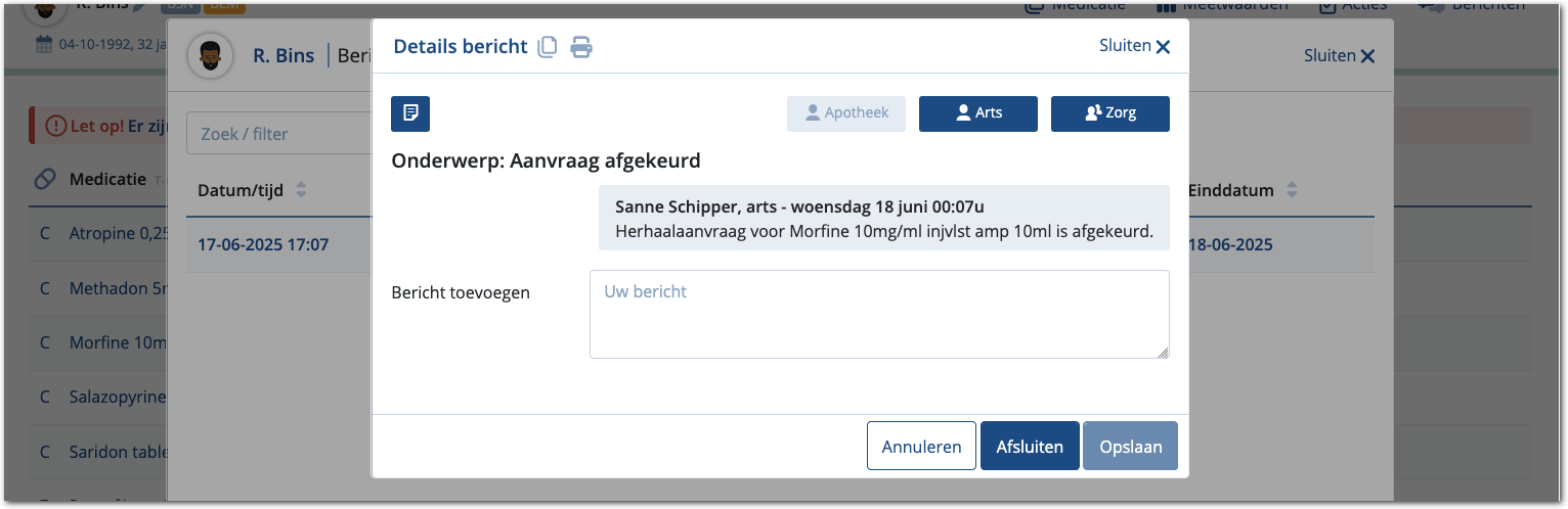 Bent u akkoord met de aanvraag, dan geeft u met de knop Goedkeuren uw fiat. De aanvraag wordt daarna verzonden naar de apotheek. Indien nodig kunt u de aanvraag aanpassen voordat u die goedkeurt. Bent u van mening dat er geen opiaten mogen worden aangevraagd? Gebruik dan de knop Afkeuren. In dat geval wordt er geen bestelling verzonden naar de apotheek. Ook wordt bij de cliënt vastgelegd in de Berichten dat de aanvraag is afgekeurd. In de afbeelding hieronder ziet u daarvan een voorbeeld.