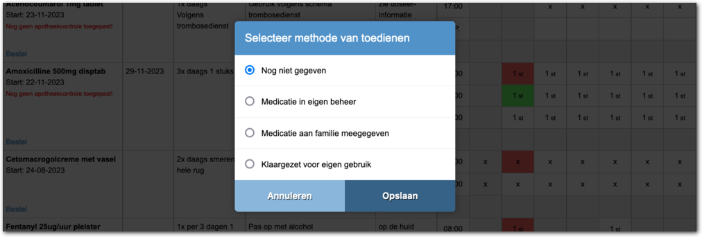 Er zijn situaties waarbij u een andere registratie wilt gebruiken. Bijvoorbeeld wanneer medicatie is geweigerd of is meegeven aan familie. Door het vakje met de rechtermuisknop aan te klikken (pc/laptop) krijgt u een keuzescherm met meer opties: