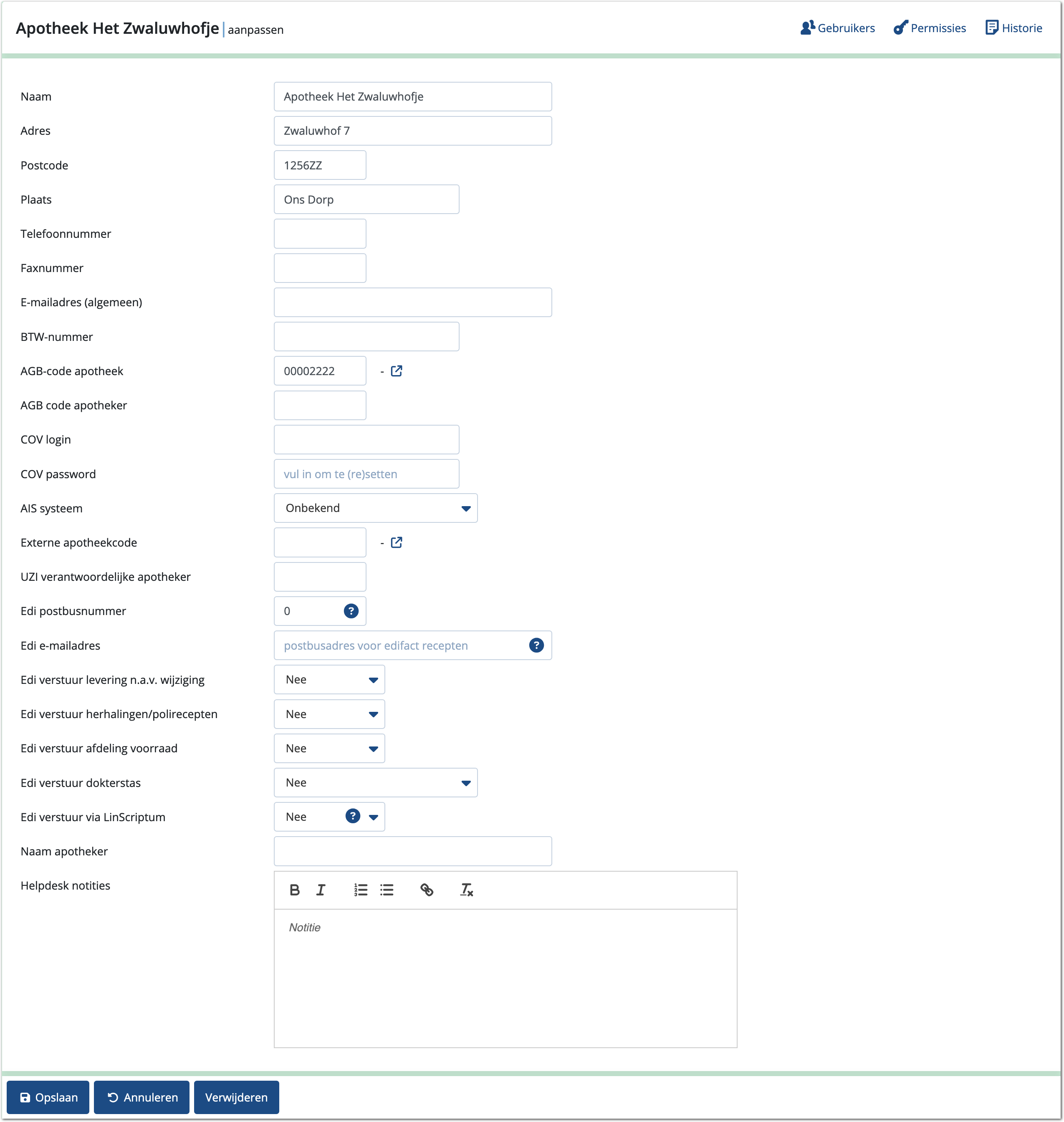 Bij uw apotheek entiteit stelt u in wanneer u bij een aanvraag of registratie werkvoorraad een EDIFACT wenst te ontvangen. Dit geldt dan voor alle cliënten waarbij u met Medimo werkt. U hebt hierbij ook de keuze uit de optie 'Door settings bepaald'. Hiermee kunt u per locatie entiteit een onderscheid maken in het ontvangst van EDIFACT. Dit doet u dan door het toevoegen van deze settings.