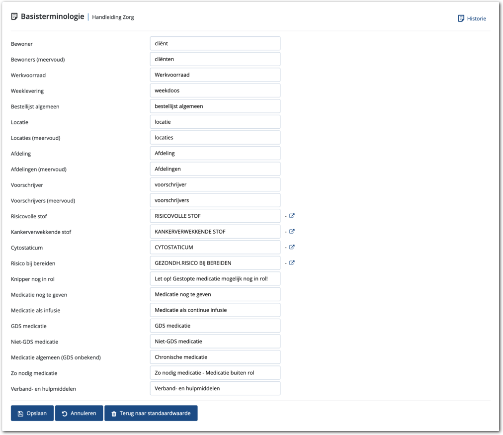 Binnen uw organisatie worden vaktermen gehanteerd. Om Medimo beter hierop te laten aansluiten, kunt u basisterminologie definiëren. Deze terminologie is van toepassing op alle gebruikers binnen het cluster. Meestal wordt tijdens de implementatie van Medimo bepaald welke termen er worden gebruikt. Dit artikel beschrijft welke termen u kunt aanpassen en waar deze in Medimo terugkomen. Alleen functioneel applicatiebeheerders hebben de bevoegdheid om de basisterminologie te wijzigen.
