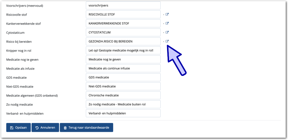 Bij een aantal termen wordt een snelkoppeling icoon getoond. Hiermee navigeert u naar een overzicht van de betreffende term. Daar kunt u nagaan voor welke geneesmiddelen de term worden gebruikt. De onderstaande afbeelding is een voorbeeld van een deel van de basisterminologie tabel. De blauwe pijl wijst naar een snelkoppeling icoon.