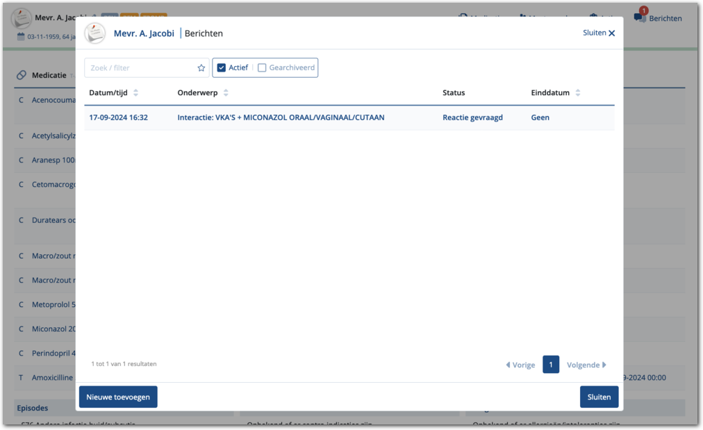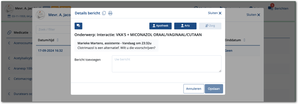 In de zorg is duidelijke en veilige communicatie essentieel, vooral als het gaat om medicatiebeheer. Met de berichtenfunctie kunnen voorschrijvers, apotheken en de zorg eenvoudig met elkaar communiceren betreffende de medicatie van de cliënt. Of het nu gaat om het delen van nieuwe voorschriften, het bespreken van wijzigingen of het stellen van vragen – alles gebeurt via een beveiligd platform dat de privacy van de cliënt waarborgt. Deze handleiding leidt u stap voor stap door het gebruik van deze berichtenfunctie, zodat u optimaal kunt profiteren van de voordelen van deze efficiënte communicatietool.