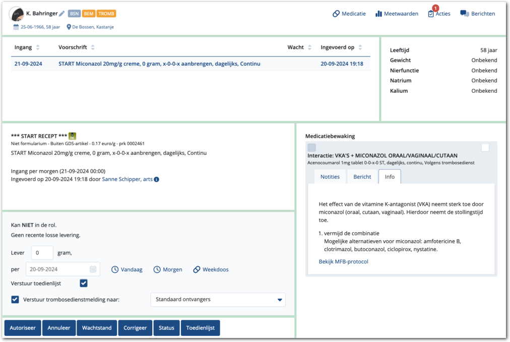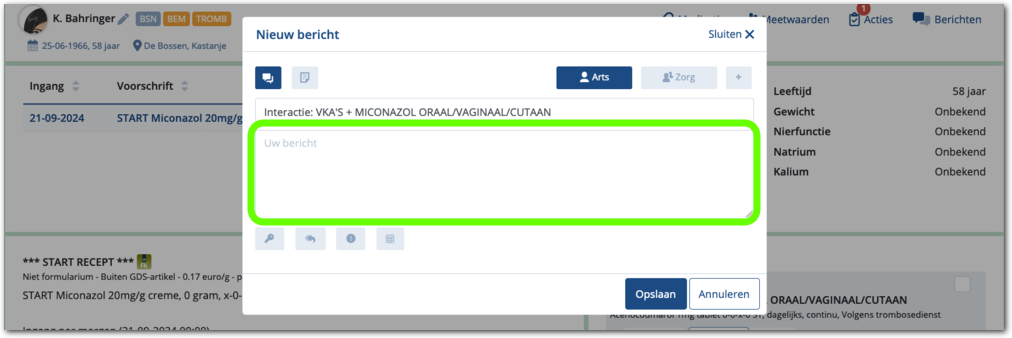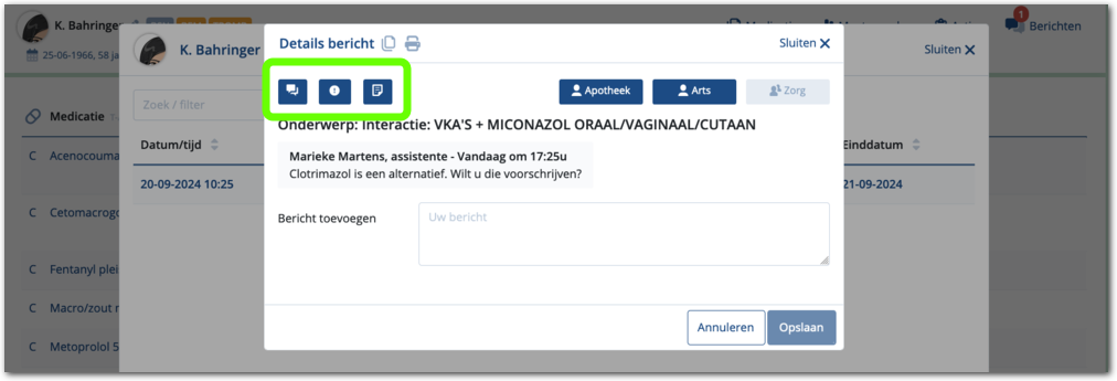 Berichten kunnen onder andere in de status van de cliënt, tijdens voorschrijven en autoriseren van medicatie-opdrachten en bij een Medicatie Beoordeling (MBO) worden gemaakt. Voor alle plekken geldt dat de werking hetzelfde is. We gebruiken in dit artikel het autoriseren van een medicatie-opdracht als voorbeeld. Daar kunt u onder andere vanuit de medicatiebewaking een bericht maken.
