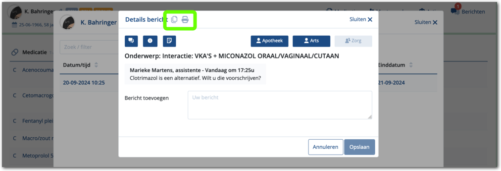Bovenin aan de linkerzijde worden icoontjes weergeven om het bericht te printen of te kopiëren naar het klembord.