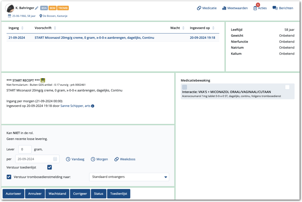 Hiermee wordt het autoriseren van de medicatie-opdracht van de voorschrijver bedoelt. De onderstaande afbeelding is hiervan een voorbeeld.