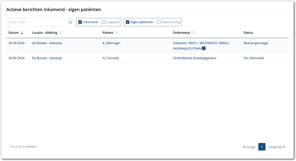 Hier worden alle inkomende berichten van cliënten waarvoor u permissies hebt weergegeven. Standaard wordt de filter toegepast om alleen berichten van uw eigen cliënten te zien. Zijn er geen inkomende berichten betreffende uw eigen cliënten, dan worden de berichten van cliënten waarvoor u waarneemt getoond. Met de quickfilter 'Eigen cliënten | Waarneming' kunt u zelf schakelen tussen deze twee weergaven.