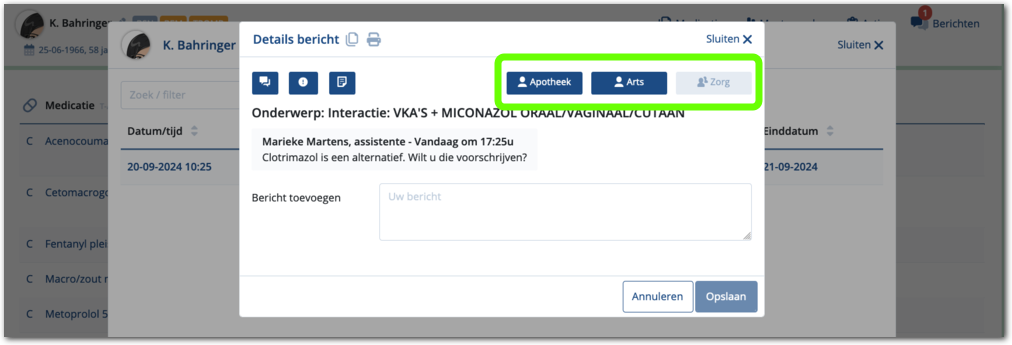 Dit kunnen artsen, apotheekmedewerkers of de zorg zijn. Alleen voor deelnemers is het bericht zichtbaar. De deelnemers herkent u aan de donkerblauwe kleur. Naast een groep deelnemers, kan een verzender ook extra specifieke gebruikers deel laten nemen aan het bericht. U kunt dat nagaan door met de muis naar de groep deelnemers te gaan.