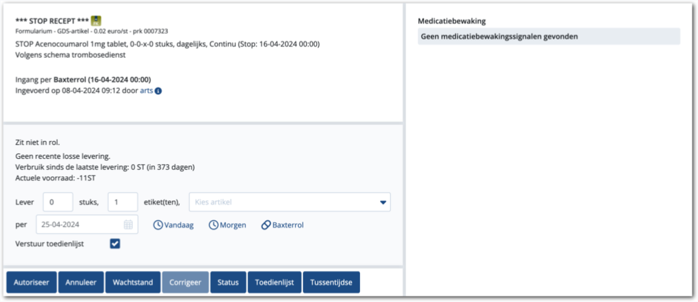 Indien u met DirectPrint werkt, wordt tijdens autoriseren van medicatie-opdrachten een extra veld getoond in het vlak om de te leveren stuks op te geven. De onderstaande afbeelding is daarvan een voorbeeld