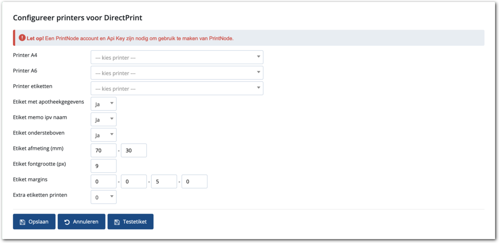 Op basis van de API-key wordt een lijst met beschikbare printers getoond. De gekozen printers worden bewaard in cookies. U kunt een printer instellen voor A4, A6 en etiketten. In principe worden voor nu uitsluitend etiketten geprint.