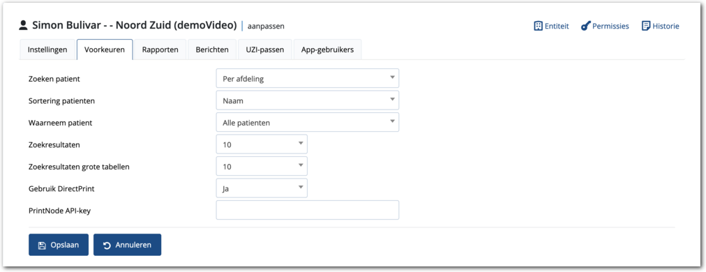 In Medimo dient per gebruiker die gaat printen te worden ingesteld dat die werkt met DirectPrint. De beherend apotheker stelt dit in bij het tabblad 'Voorkeuren' in het account overzicht van de gebruiker. De onderstaande afbeelding is daarvan een voorbeeld.