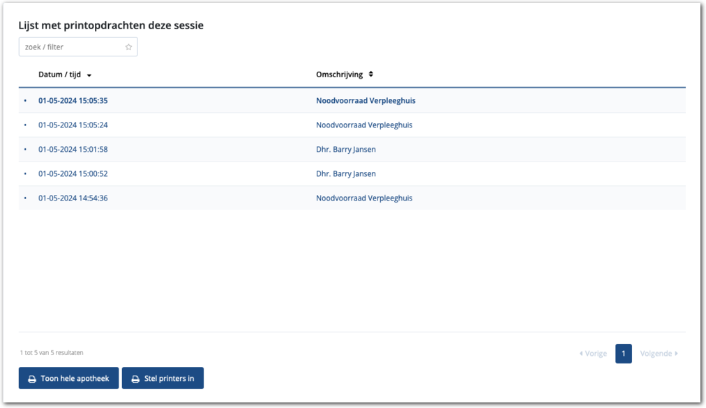 Wanneer u op een printopdracht klikt wordt deze opnieuw naar de printer gestuurd. Ook kunt u er voor kiezen om de printopdrachten van andere/oudere sessies te tonen, klik hiervoor op 'Toon hele apotheek'.