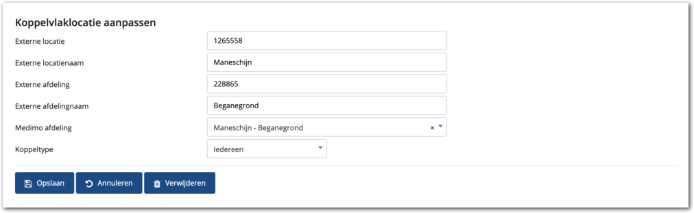 Externe locatie, locatienaam, afdeling en afdelingnaam zijn gegevens die uit Pluriform komen. Dit zijn de namen en ID's van de locaties in Pluriform. Bij een mutatie gaat Medimo na op welke Pluriform locatie/ID de cliënt verblijft en in hoeverre deze is gekoppeld in de 'Koppelvlaktabel webservices'. Medimo gebruikt hiervoor de velden Externe locatie en Externe afdeling. Medimo raadt aan deze velden NIET aan te passen.