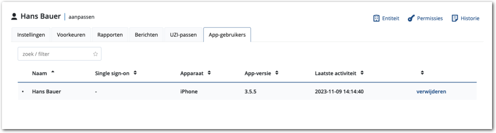 Indien gewenst kan vanuit hier een app worden ontkoppelt via de link 'verwijderen'. Deze link wordt in de regel aan de rechterzijde getoond.