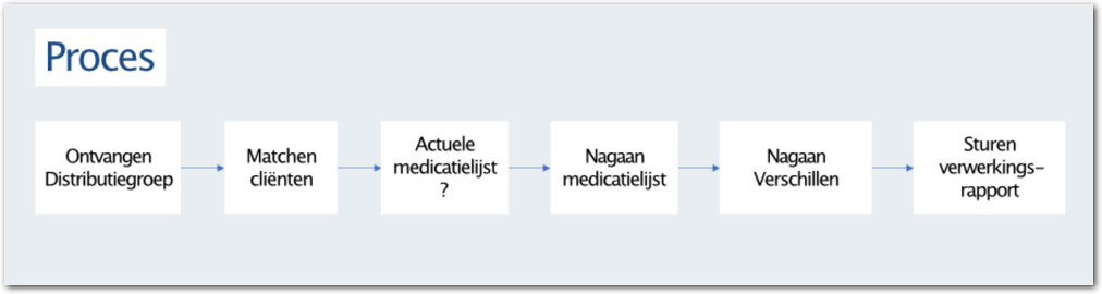 Als de medicatie van de cliënt uit de distributiegroep voldoet aan alle voorwaarden gaat Medimo na wat het verschil in de medicatielijsten is. Zit er een verschil in, dan past Medimo de status aan van de cliënt aan.
