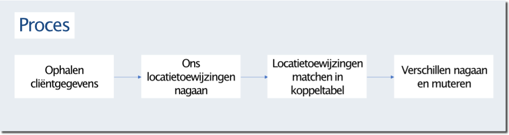 De volgende stap is het nagaan van de locatietoewijzingen van de cliënt in Ons. Medimo gaat daarbij de volgende informatie na: - ID van Ons locatie.