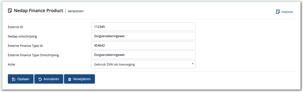 De bovenste 4 velden zijn gegevens die uit Ons komen. Medimo zoekt op het Externe ID in de 'Koppelvlaktabel Nedap Financetypes'.