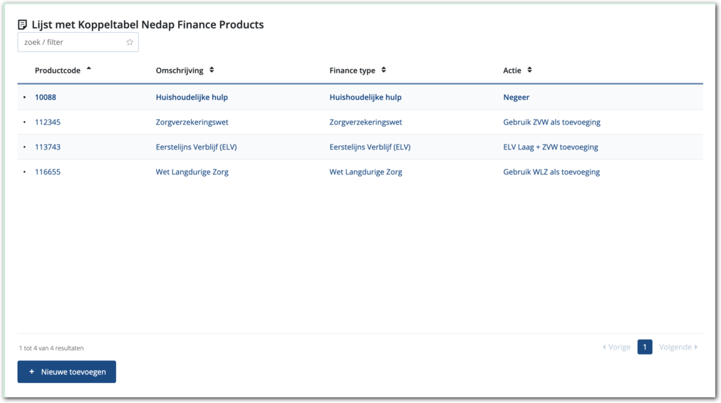 koppelen van Ons zorglegitimatie en/of Ons declaraties aan een actie. Deze actie bepaald of en zo ja welke toevoeging er wordt gerbuikt voor de ONS-toewijzingen. U hoeft alleen regels te koppelen die u wilt gebruiken voor de koppeling. Niet-gekoppelde regels worden door Medimo genegeert. Gebruik het 'Zoeken in alles' veld of klik vanuit het hoofdmenu op Beheer > Koppelvlak beheer > Koppelvlaktabel Nedap Finanacetypes om te navigeren naar deze tabel. Onderstaande afbeelding is een voorbeeld van een
