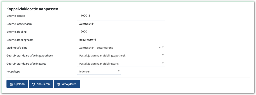 | Medimo negeert deze regel. Anders gezegd, Medimo negeert deze Ons locatietoewijzing. Ondanks dat Medimo deze regel negeert moet u de regel koppelen aan een Medimo afdeling. Meestal is hiervoor een afdeling 'Overig' beschikbaar. |