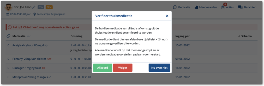 Wanneer de import bij de cliënt wordt uitgeschakeld, wordt de actie 'Verifieer thuismedicatie' toegevoegd. Deze actie toont Medimo aan de voorschrijver wanneer de status wordt geopend. De onderstaande afbeelding is daarvan een voorbeeld.