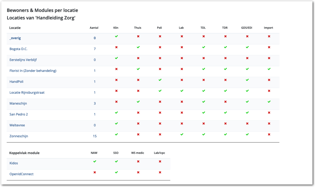 Gebruik het 'Zoeken in alles'-veld of klik in het hoofdmenu op Beheer > Klantenportaal > Cliënten & modules per locatie. Hier wordt een overzicht van aangemaakte locaties en de geactiveerde modules getoond. Dit komt overeen met de onderstaande afbeelding.