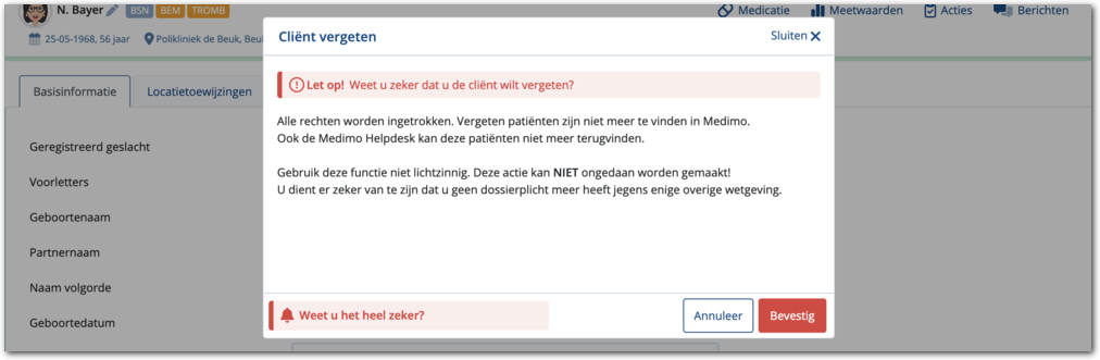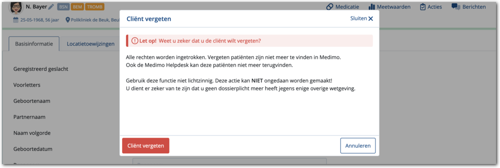 In Medimo is hiervoor een voorziening getroffen. Functioneel applicatiebeheerders kunnen cliënten laten 'vergeten'. Dit betekent dat alle rechten naar de cliënt worden ingetrokken. Vergeten cliënten zijn niet meer te vinden in Medimo.