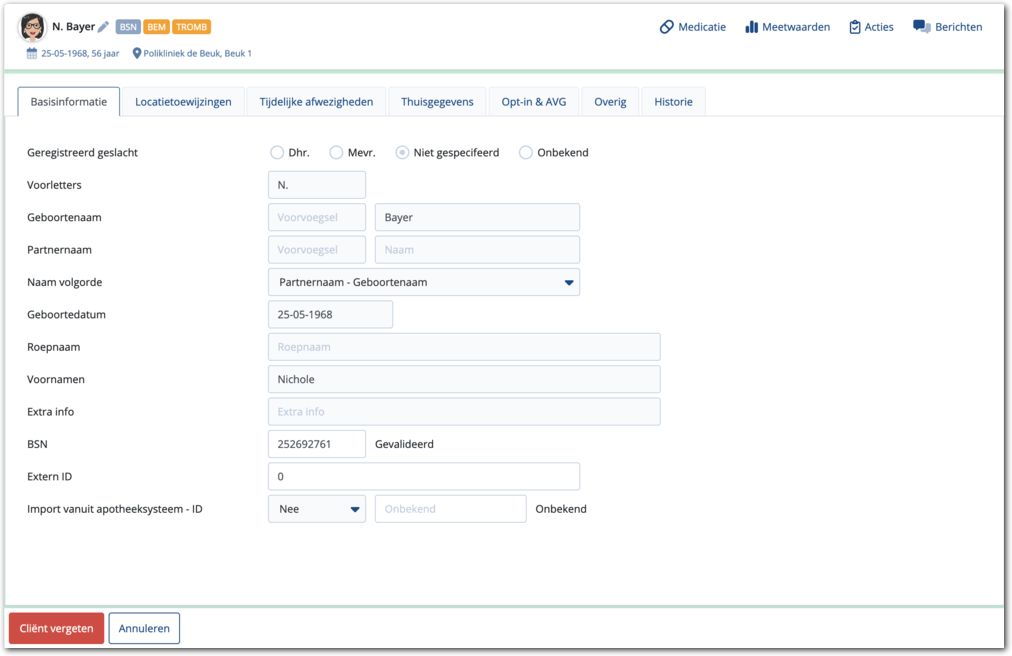 Een cliënt laten vergeten kan vanuit het tabblad 'Basisinformatie' in de niet-medische gegevens van de cliënt. De onderstaande afbeelding is hiervan een voorbeeld.