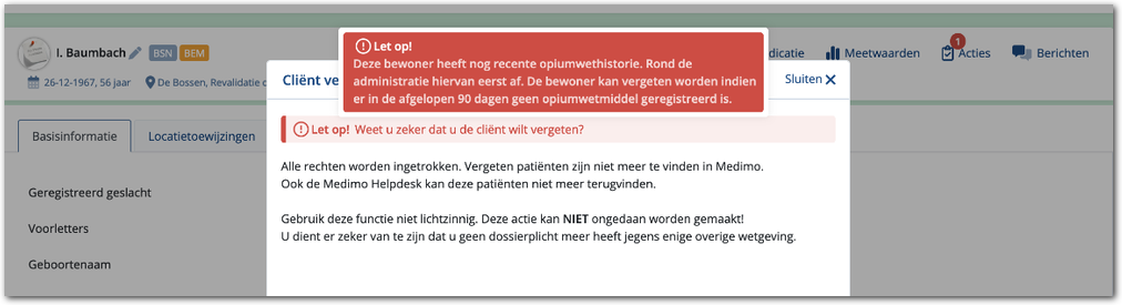 Is er recent een opiaat voorgeschreven, geleverd of toegediend aan de cliënt, dan wordt het vergeten van de cliënt geblokkeerd. In dat geval dient namelijk de administratie daarvan eerst te worden afgerond. Deze blokkade blijft tot 90 dagen na de laatste opiaat registratie. Dit wordt ook aan de functioneel applicatie beheerder gemeld als die de cliënt probeert te vergeten. De onderstaande afbeelding is hiervan een voorbeeld.