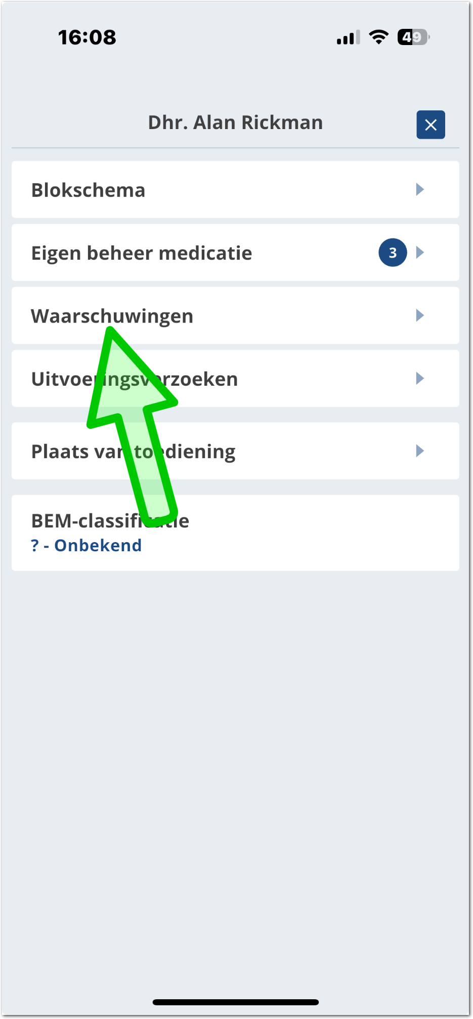 U kunt, mits uw zorgorganisatie dat heeft gedefinieerd, zelf waarschuwingen toevoegen. Dit kan aan de cliënt, maar ook aan een specifiek middel dat de cliënt gebruikt. Hiermee attendeert u collega's op wat er speelt bij de cliënt.