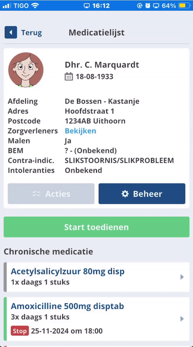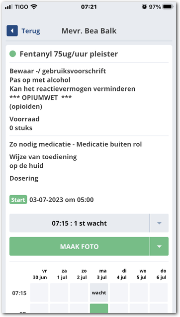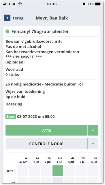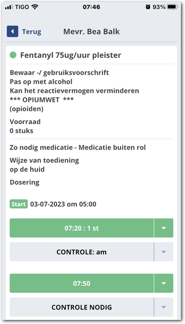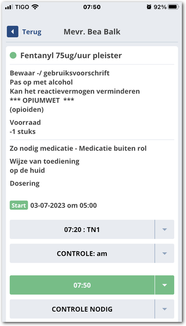 Voor een aantal geneesmiddelen geldt dat er een extra controle door een collega moet worden gedaan. Deze collega dient een paraaf op te geven waarmee wordt vastgelegd dat er een extra controle is uitgevoerd. U herkent een geneesmiddel dat een extra controle behoeft aan de grijze balk 'CONTROLE NODIG'. De onderstaande afbeelding is hier een voorbeeld van.
