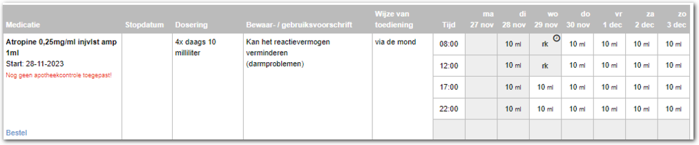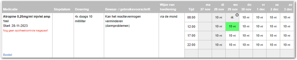 Medicatie dat gegeven mag worden, herkent u aan de groene vakjes. In onderstaand voorbeeld betreft het de Atropine 0,25mg/ml injvlst amp 1ml.