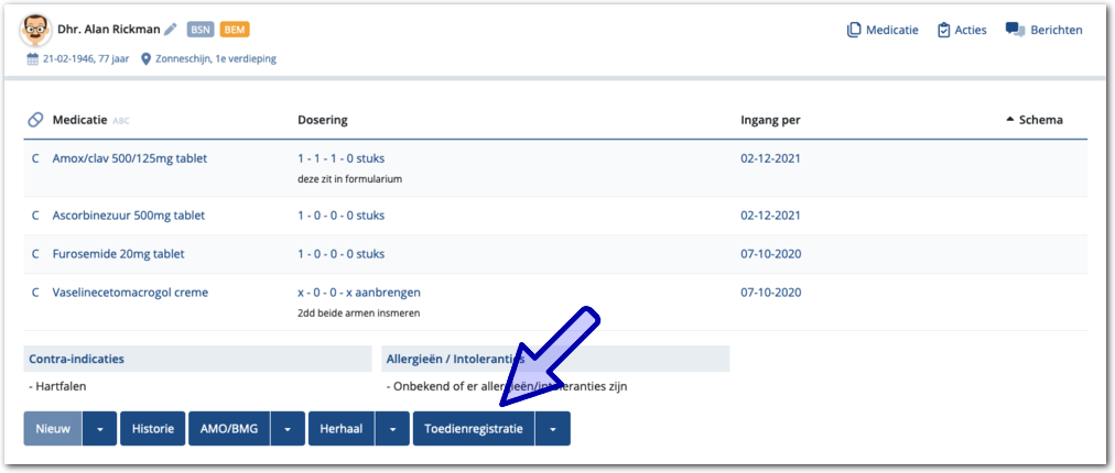 U kunt de toedienregistratie van een cliënt openen met de knop 'Toedienregistratie' in de