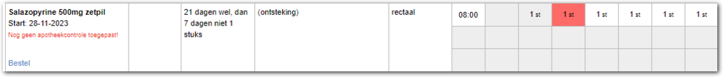 Het aftekenvakje van medicatie dat mag worden toegediend kleurt 1,5 uur voor het toedienmoment tot 1,5 uur na het toedienmoment groen van kleur. Als deze drie uur verstreken zijn wordt het 'aftekenvakje' rood. Dit vakje blijft rood tot 6 uur na het toedienmoment. Dit onderstaande afbeelding is hiervan een voorbeeld.
