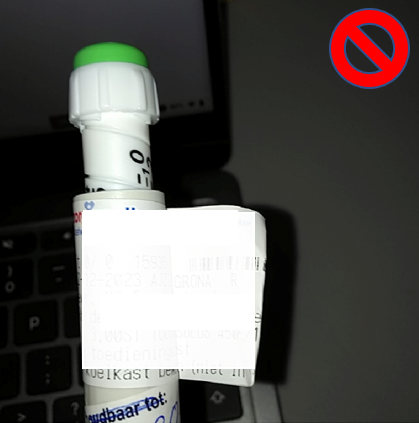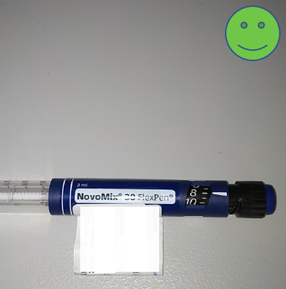 FOUT! ❌ Insulinepen verticaal in beeld ❌ Naam niet zichtbaar ❌ Eenheden niet duidelijk in beeld | GOED! ✅ Insulinepen horizontaal in beeld ✅ Naam duidelijk zichtbaar ✅ Aantal eenheden duidelijk in beeld |