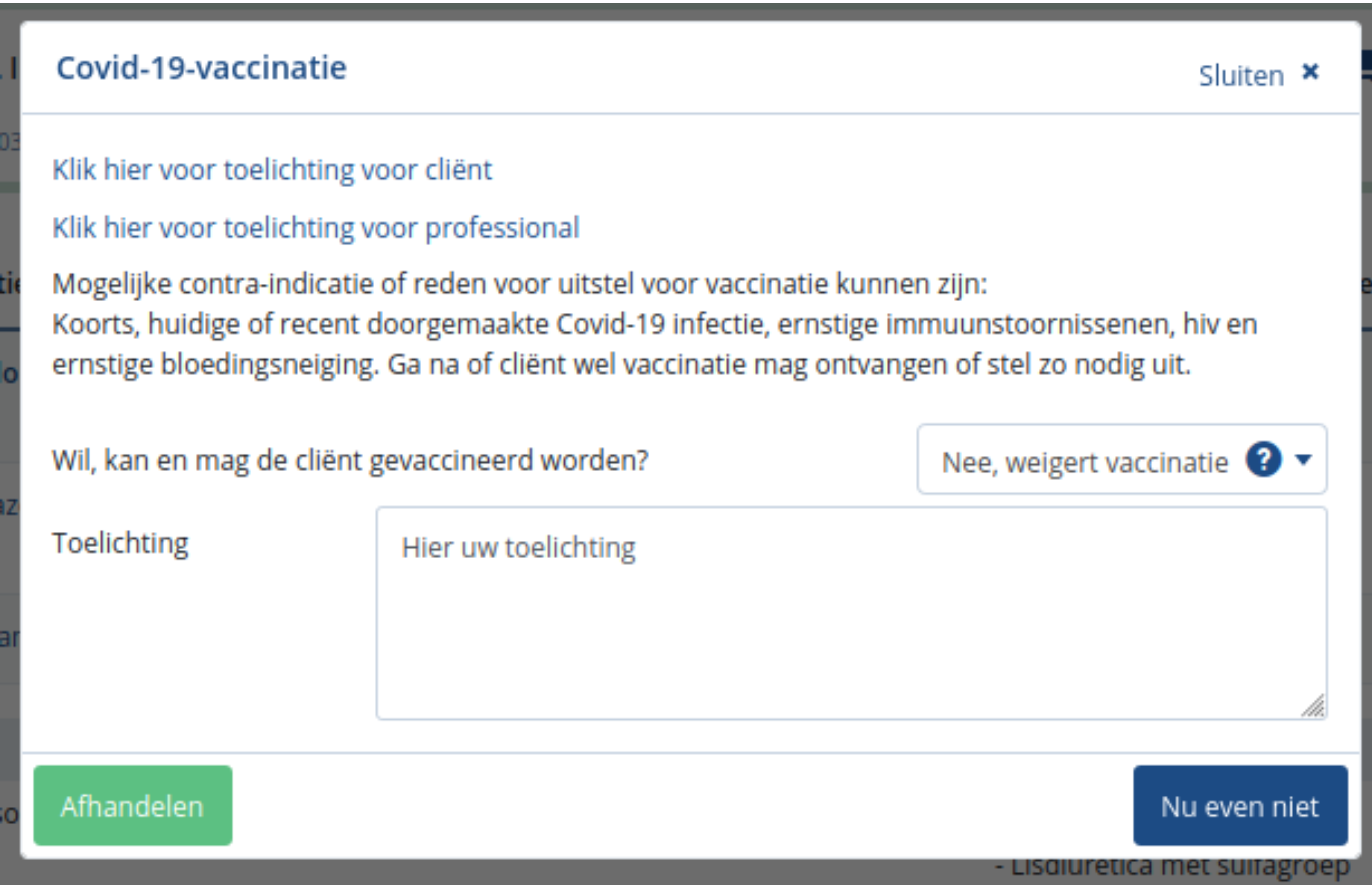 Mogelijk wenst de bewoner niet gevaccineerd te worden. Wanneer u de actie opent heeft u de mogelijkheid om te kiezen voor de optie 'Nee, weigert vaccinatie'. Er wordt dan vastgelegd dat de bewoner de vaccinatie weigert. Deze informatie wordt voor covid-19-vaccinaties geaggregeerd aan het RIVM gerapporteerd.