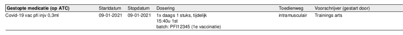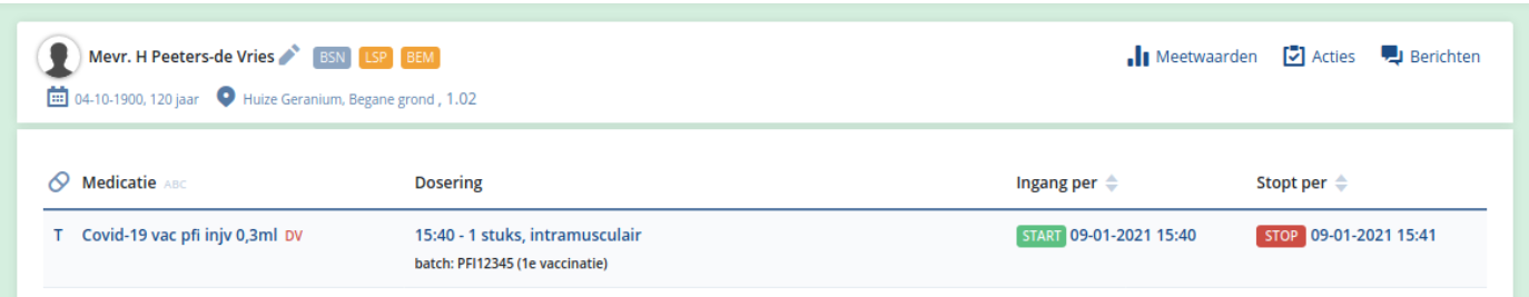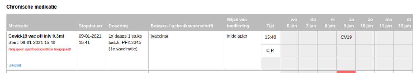 Door de registratie in te voeren wordt er automatisch een medicatie-opdracht geregistreerd per dat moment. De registratie is daardoor ook te zien in de medicatiestatus, de historie, het AMO/BMG en de toedienlijst. Het voorschrift wordt geregistreerd op naam van degene die de registratie uitvoert. De mutatie hoeft niet geautoriseerd worden door de apotheek. Het voorschrift wordt als 1x daags 1 stuks, intramusculair gedoseerd, met de vermelding 'Ingevoerd met Covid-19-module' en vermelding van het batchnummer in de vrije tekst.