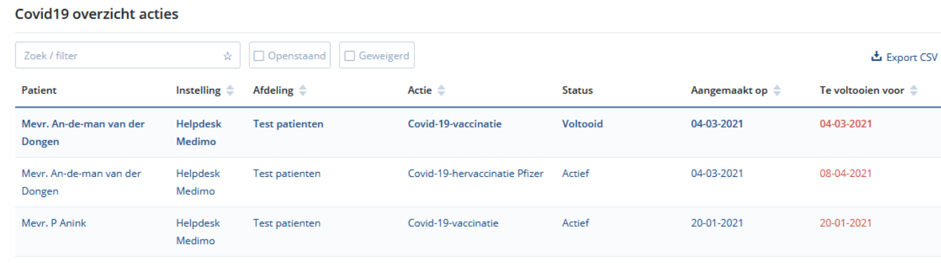 Er is ook een overzicht met alle (al dan niet) openstaande acties t.b.v. de vaccinaties. Daarmee kunt u ook een overzicht krijgen van alle op dit moment nog openstaande acties (en kunt u van hieruit ook direct registreren), of kunt u dit overzicht gebruiken om een beeld te krijgen hoeveel acties zijn uitgevoerd, en hoeveel vaccinaties zijn geweigerd of om andere reden niet zijn uitgevoerd.