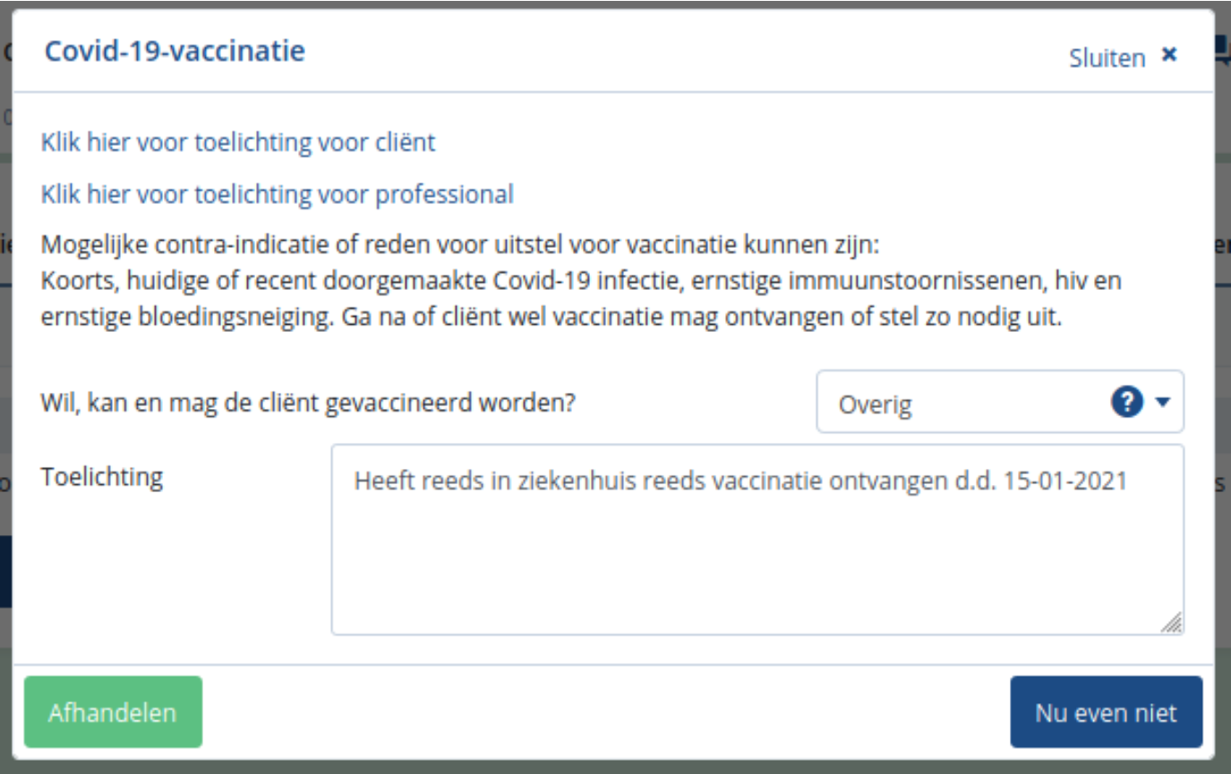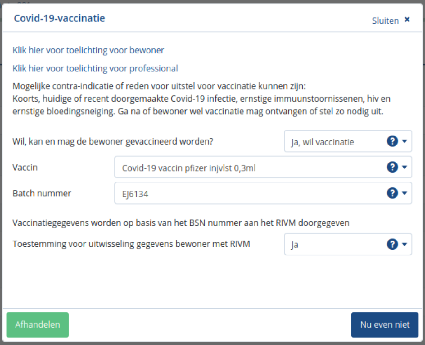 Wanneer een bewoner geopend wordt die een openstaande actie heeft van een vaccinatie, dan wordt direct een pop-up geopend. Dat wordt gedaan om snel te zien wie nog geen vaccinatie heeft gehad en om dit eenvoudig te kunnen invoeren. Ook wordt dit gedaan om hervaccinaties of uitgestelde vaccinaties niet te vergeten.