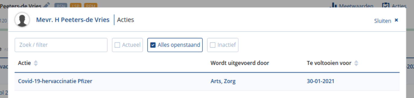 Het advies is derhalve om de acties pas aan te maken wanneer er ook werkelijk gevaccineerd zal gaan worden! Bijvoorbeeld met behulp van een protocol voor de hele afdeling ineens voorafgaand aan de vaccinaties.