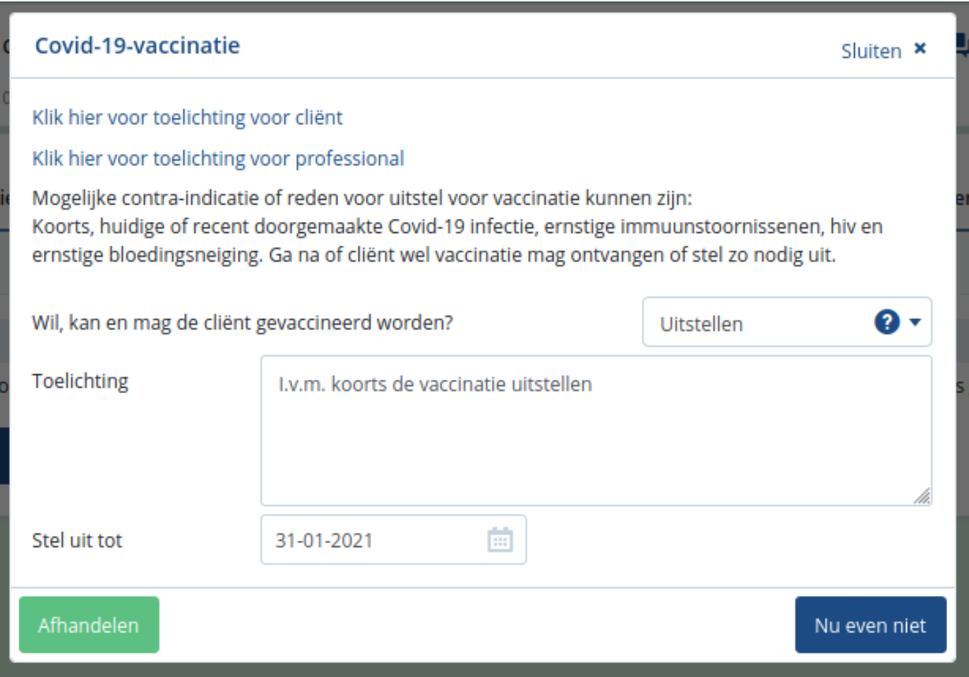 Mogelijk is het nu niet wenselijk voor bepaalde bewoners om de vaccinatie nu te ontvangen. Wanneer u de actie opent heeft u ook de mogelijkheid om de actie uit te stellen. U kunt dan een nieuwe datum opgeven wanneer u de actie weer automatisch ophoog wilt laten komen. Deze bewoners tellen nog niet mee voor de geaggregeerde data richting het RIVM, pas wanneer er een registratie of weigering vastgelegd wordt.