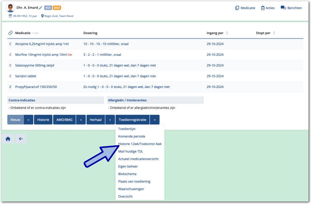 U kunt de historie van de toedienregistratie raadplegen. Hierbij heeft u de keuze uit: