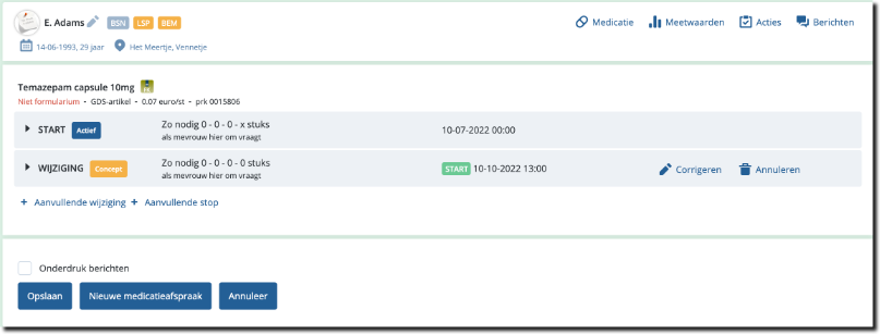 Medimo toont het overzicht medicatiebehandeling met de correctie, deze is te herkennen aan het gele 'Concept' label. Onderstaande afbeelding is daarvan een voorbeeld.