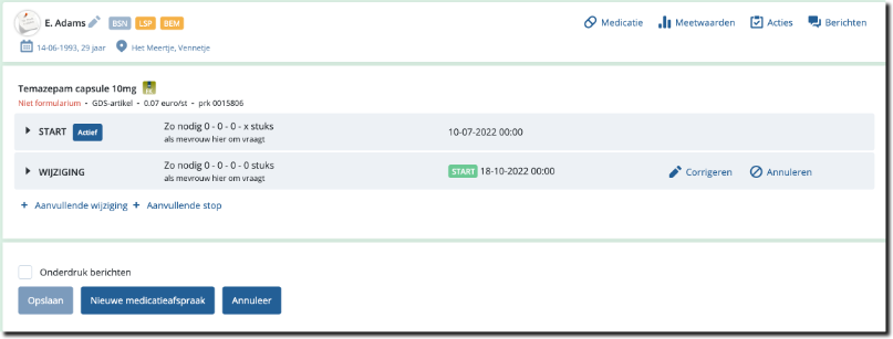 Dit kan met de link 'Wijzigen' in het overzicht medicatiebehadeling. Het overzicht medicatie behandeling opent u door te klikken op een medicatieregel in de status van de cliënt. Onderstaande afbeelding een voorbeeld van een overzicht ...