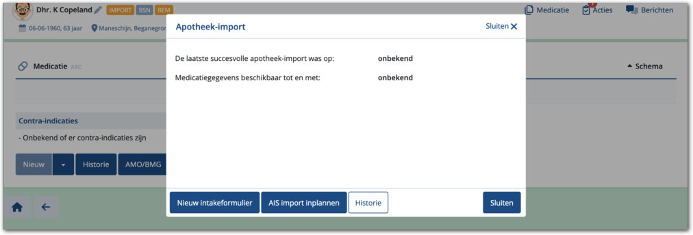 Hiermee voegt u de actie 'Intake medicatie-import' toe aan de cliënt en kunt u de pop-up sluiten. U kunt in de actielijst van de cliënt de actie openen en afhandelen en daarmee de importkoppelling activeren.
