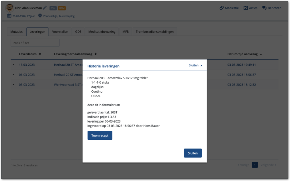 Medimo opent de details van de aanvraag in een modal. Onderstaande afbeelding is daarvan een voorbeeld.