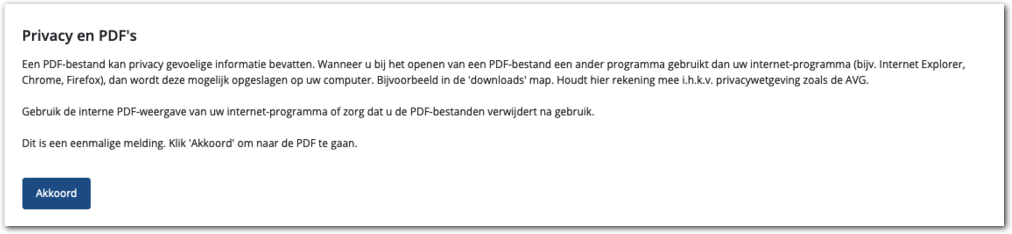 Als bovenstaande waarschuwing wordt getoond dient u op de knop 'Akkoord' te klikken om de PDF te maken.