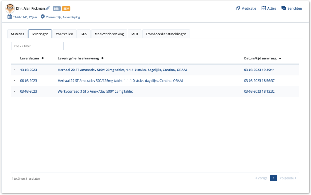 Dit kan vanuit het tabblad leveringen in de medicatiehistorie van de cliënt. Onderstaande afbeelding is een voorbeeld van de medicatiehistorie van een cliënt.