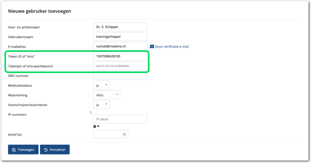 U geeft het tokenserienummer en wachtwoord op in het account van de gebruiker. In de onderstaande afbeelding zijn deze velden omlijnd.