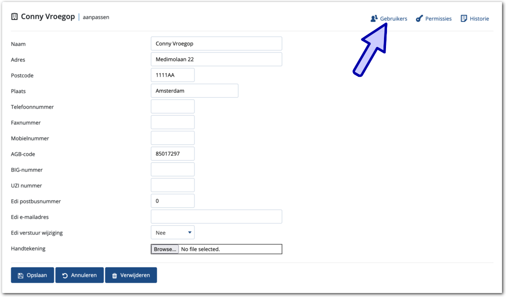 Het aanmaken van een gebruiker kan via de link gebruikers (blauwe pijl in onderstaande afbeelding) bij de arts entiteit. De onderstaande afbeelding is een voorbeeld van een arts entiteit.