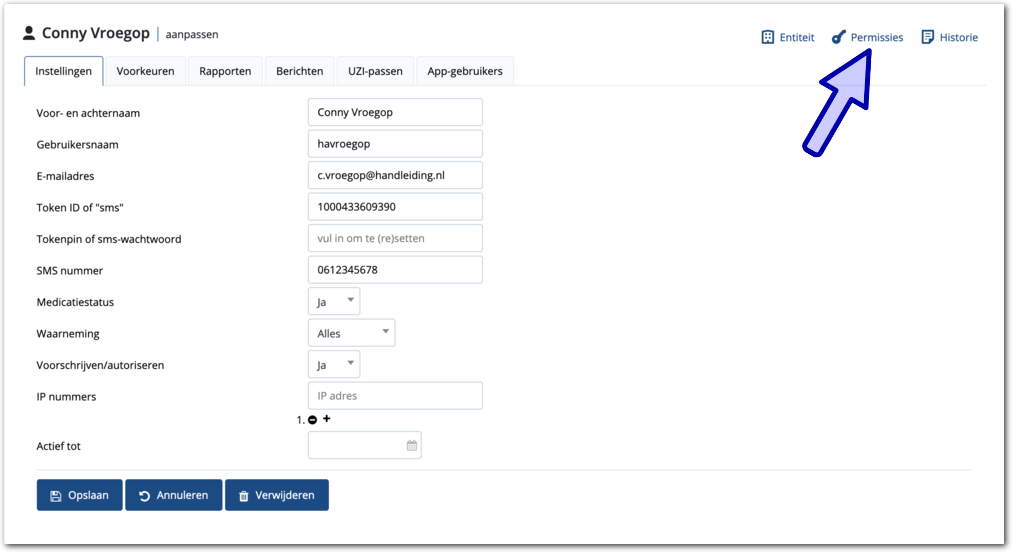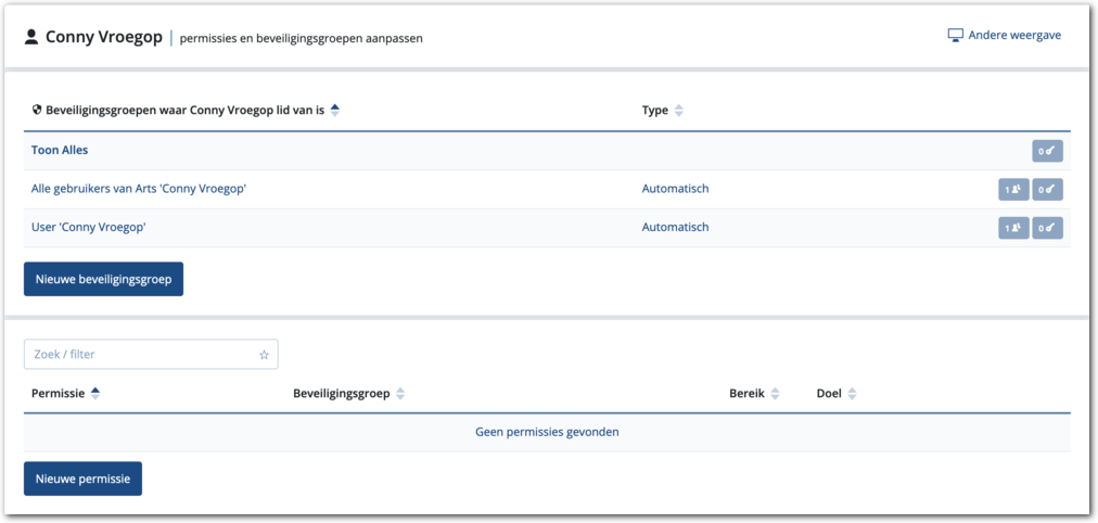 Voor artsen is doorgaans een beveiligingsgroep per cluster aangemaakt. Door de nieuwe gebruiker lid te maken van deze beveiligingsgroep ontvangt de gebruiker de benodigde permissies. Een gebruiker lid maken van een beveiligingsgroep kan via 'Permissies' (blauwe pijl in onderstaande afbeelding) in het overzicht van het account.